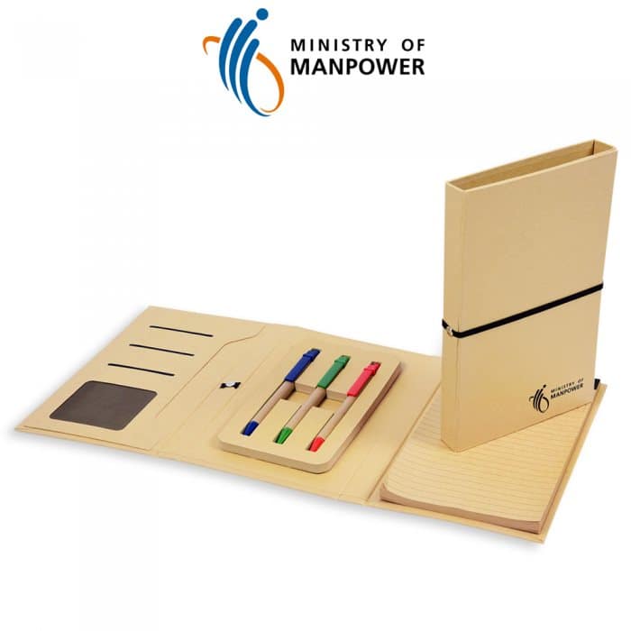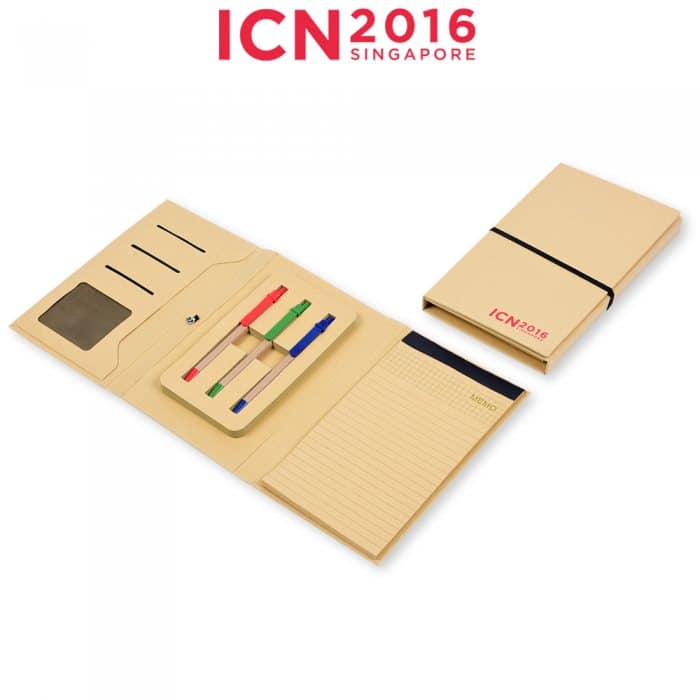 Each notepad comes with 3 coloured ball pen for note taking. Also comes with slots of holding business cards. Red, blue and green pen included.