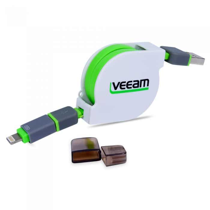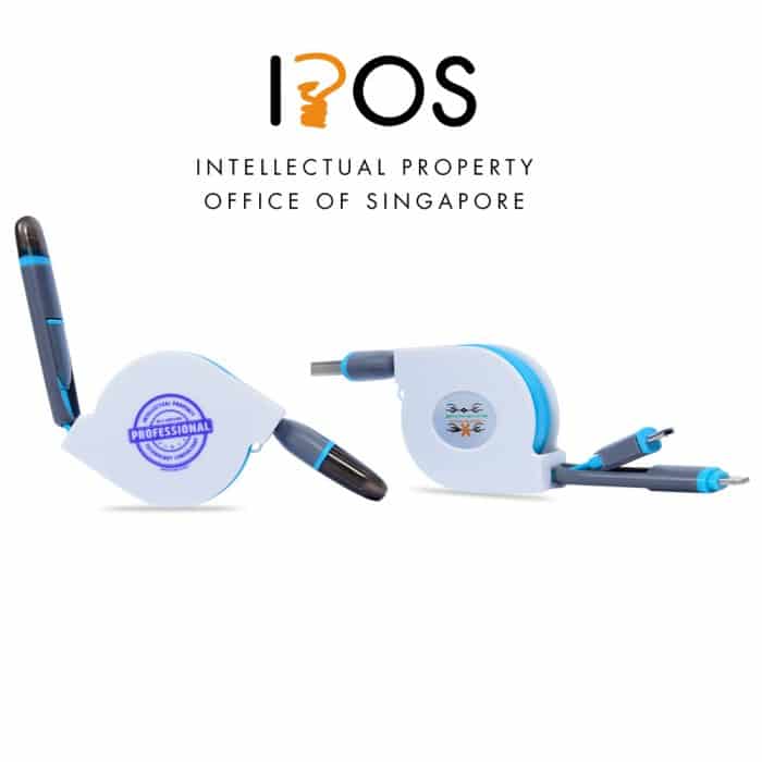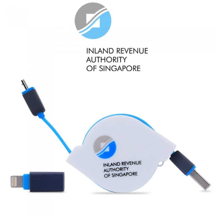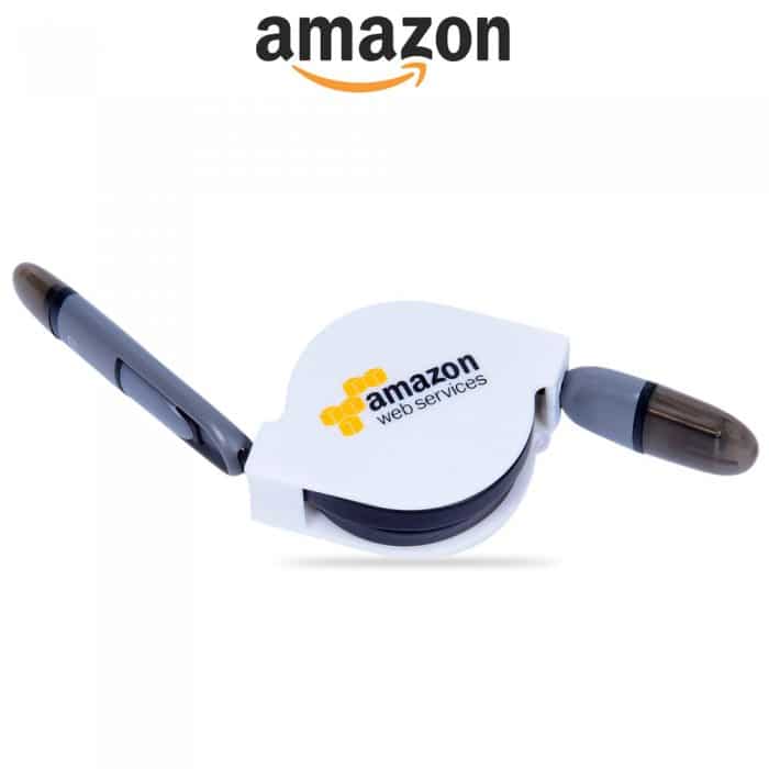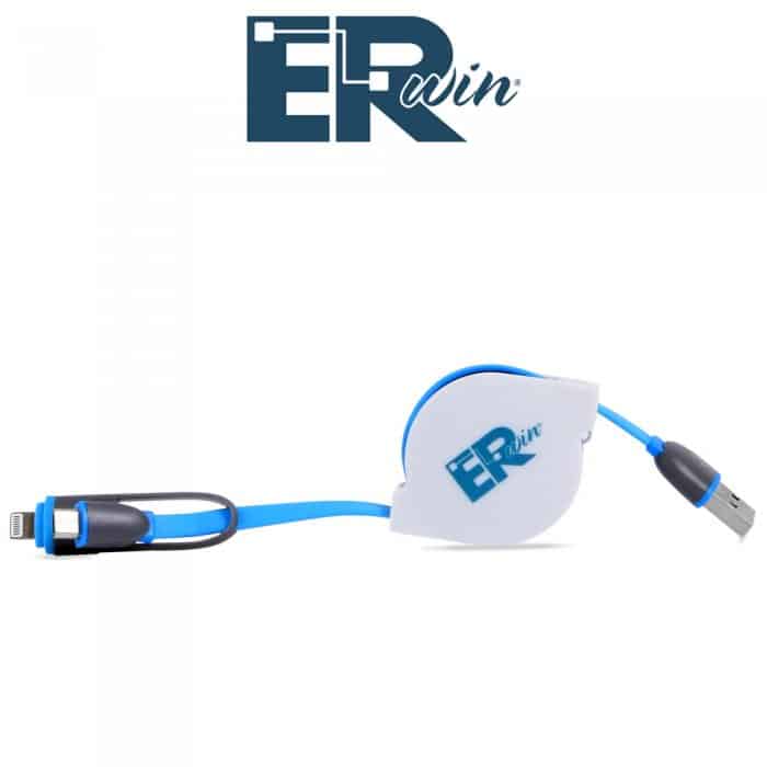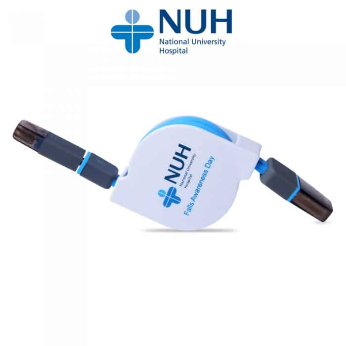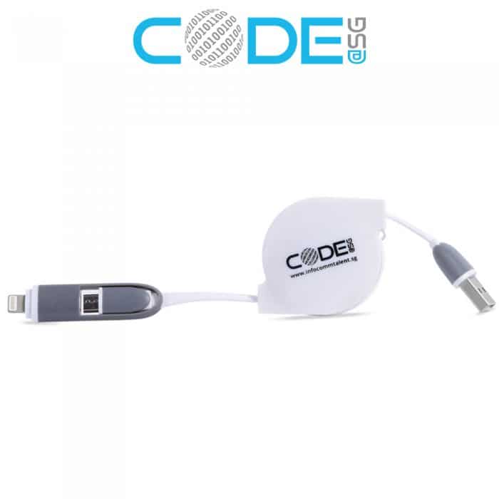 Retractable USB charging cable capable of charging both Apple and Micro USB Phones devices. (Samsung, Xiaomi etc) Includes printing on casing.