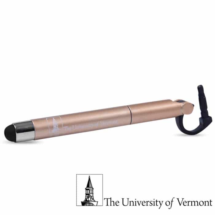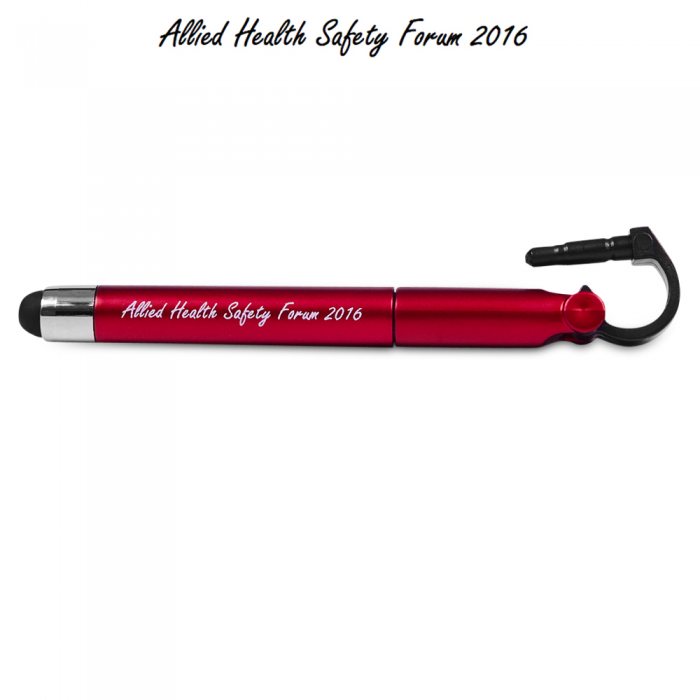 Mini-stylus for touch screen devices. Plastic pin functions as a phone stand when inserted into audio jack. Pen to write notes anywhere you are.
