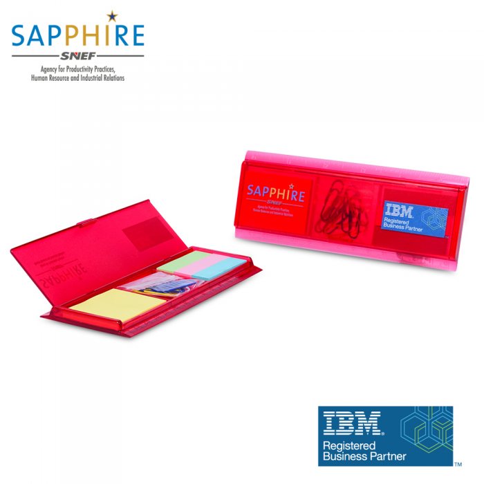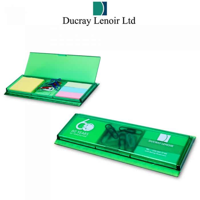 Consists of stapler, tape dispenser, assorted coloured bands, paper clips and post it pads.